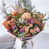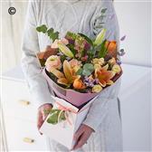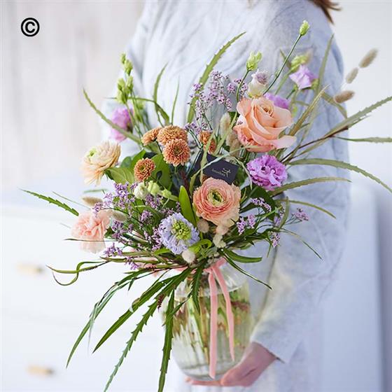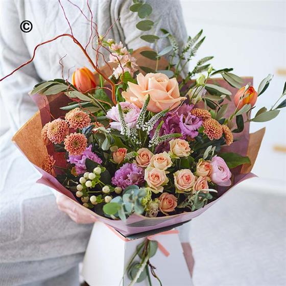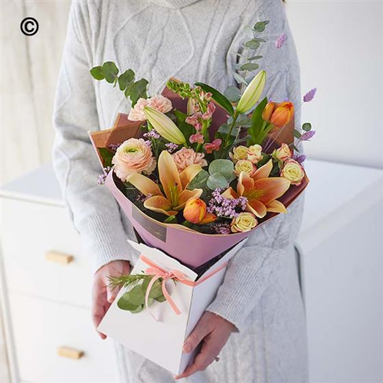 Not everyone likes lilies because they can be poisonous to certain pets. But there’s no denying the lily’s peachy credentials. And if you choose well, you can also benefit from the lily’s most fabulous scent. In our Spring Trending Hand-Tied gift box, we’ve gone for pretty peach perfection, with peach lilies, tulips, ranunculus, roses, and carnations, with a little pink larkspur, off-set with eucalyptus foliage. It’s simple, elegant, and delicate, and oh-so peachy!