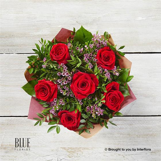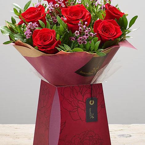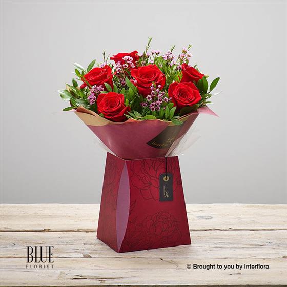 Featuring red large headed roses and pink waxflower with pistache and salal, presented in a burgundy sketch gift box