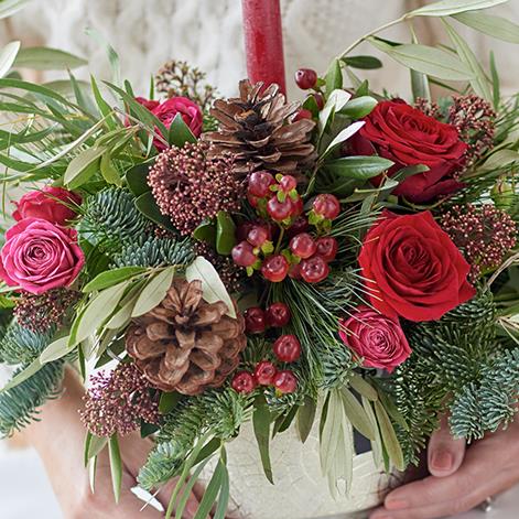 Our biggest candle arrangement, this one will bring all sorts of joy to the Christmas day table. Exquisitely handcrafted by their local florist, they'll use the freshest blooms they have in shades of plum and burgundy, red and green, with highlights of soft pink and copper.