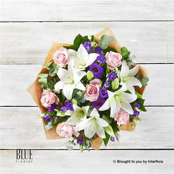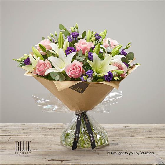 Featuring pink large headed roses, white LA lilies and purple lisianthus, hand-tied with eucalyptus and salal, and presented in Interflora Gift Packaging.