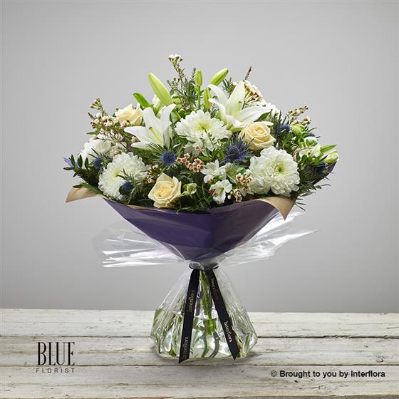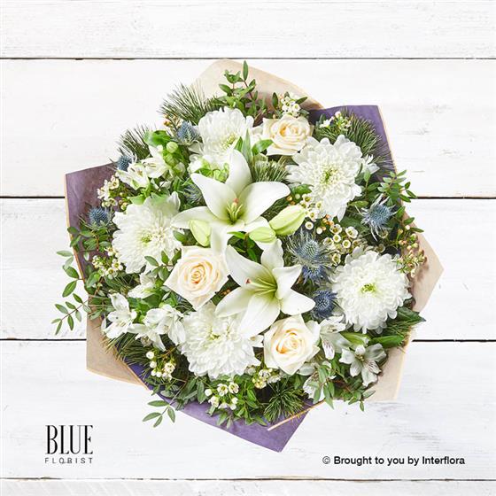 Featuring cream large headed roses, white chrysanthemums, a white LA lily, white alstroemeria, blue eryngium and white waxflower with pine and pistache, hand-tied, wrapped and presented in Interflora gift packaging.