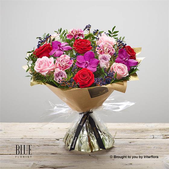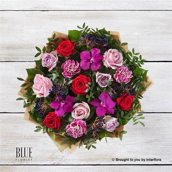 Featuring pink, lilac and red large headed roses, pink two-tone carnations and cerise vanda orchids, hand-tied with pistache, salal and viburnum, and presented in Interflora Gift Packaging.