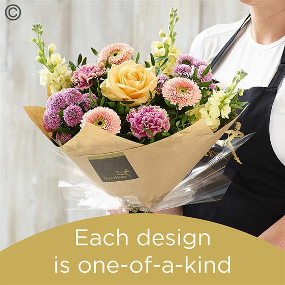 Each and every design is one-of-a-kind, created by an artisan florist using the freshest stems available on the day so, whilst your gift will look different to the one pictured, it’ll still be just as lovely.