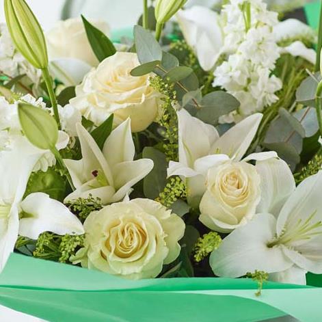 Fresh white roses and elegant white lilies are the stars of the show here. Their local florist will nestle them in amongst gorgeous foliage and other beautiful co-ordinating blooms, in an elegant bouquet, made just for them.