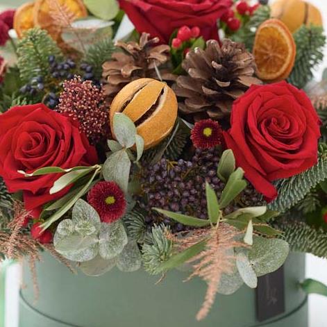 Our biggest hatbox of Christmas flowers, this beautiful arrangement will feature gorgeous blooms in shades of red and green, with peach and cream highlights and pops of burgundy and cerise.