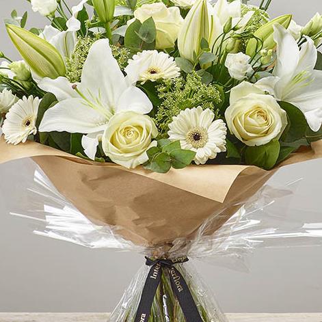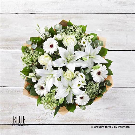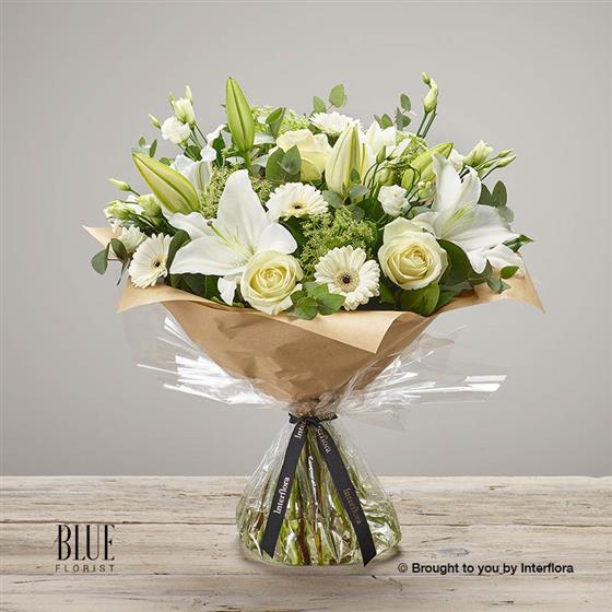 Featuring white germini, white Oriental lilies, white lisianthus, white large-headed roses and white ammi, hand-tied with eucalyptus and salal, presented in Interflora Gift Packaging.