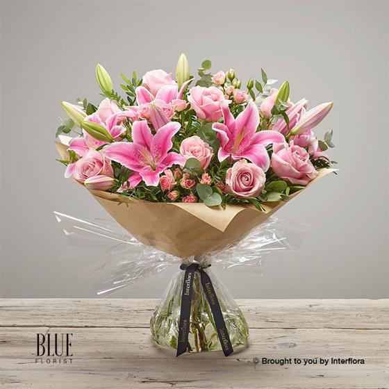 Featuring pink Oriental lilies, pink large headed roses and pink spray roses, hand-tied with eucalyptus and pistache, presented in Interflora Gift Packaging.
