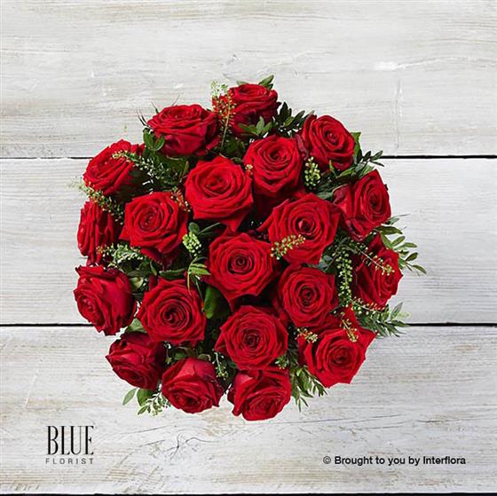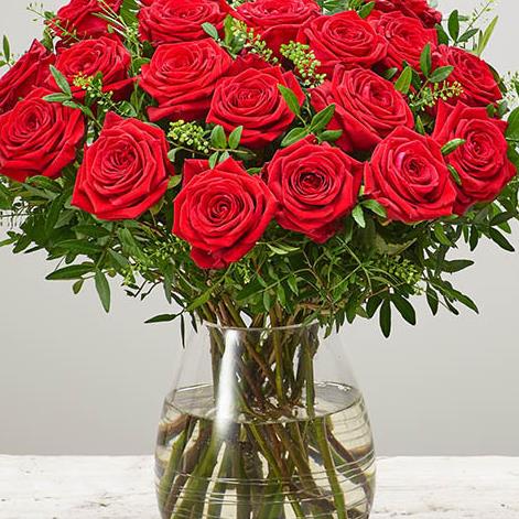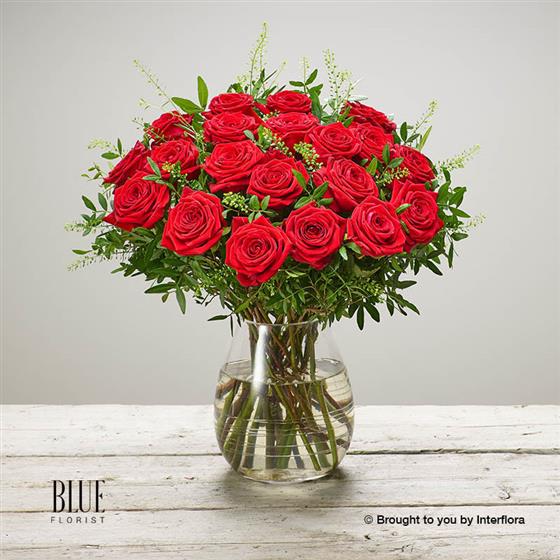Featuring 20 large headed red roses with thlaspi and pistache, presented in a clear swirl glass vase.