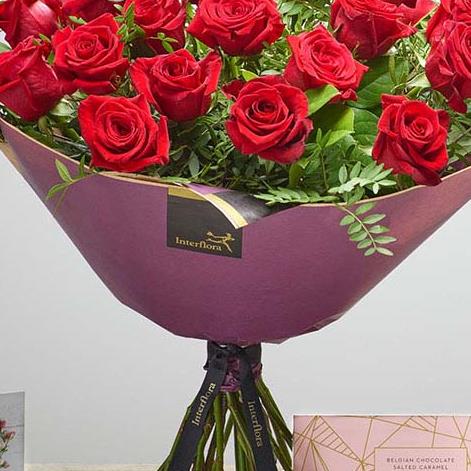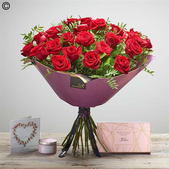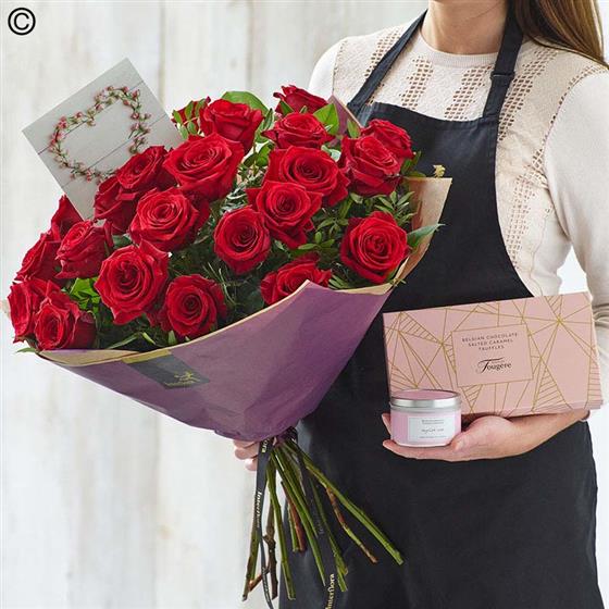 Looking to spoil them this Valentine's? This is the one for you. 24 stunning red roses, delicious salted caramel truffles, a rose scented candle, and a lovely card – just call us Cupid! Your gorgeous bouquet will be handcrafted, so while it might not look exactly like the one in the picture, it'll still be a showstopper.
