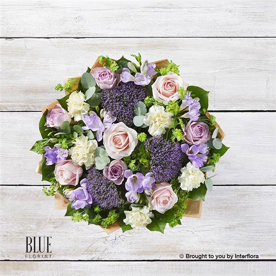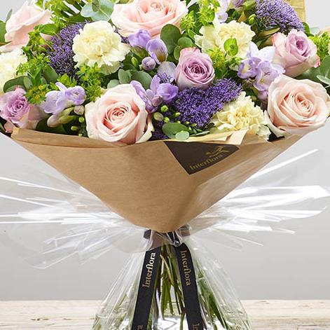 Featuring cream carnations, pale pink large headed roses, lilac large headed roses, lilac freesia, lilac trachelium, bupleurum, hand-tied with eucalyptus and salal, and presented in Interflora Gift Packaging.