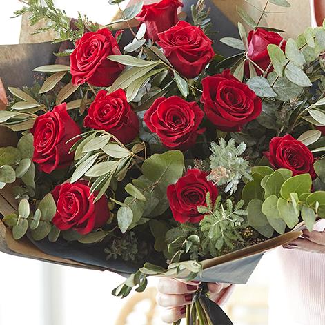 Hand-tied flowers expertly arranged and perfectly presented featuring 12 premium red roses.