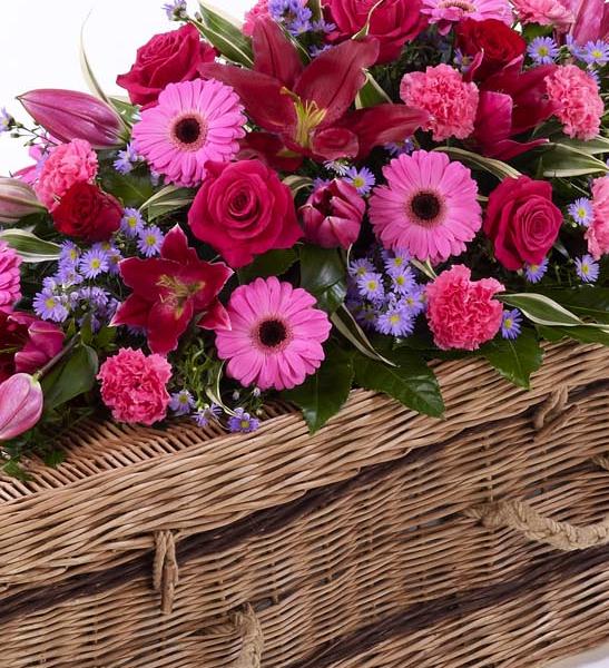 This bright casket spray feautring a classic selection of flowers in pink, red and lilac includes large-headed Rose, carnations, Gerbera and Oriental Lily complemented by luxurious foliages. Approximate height 92cm (3ft).
