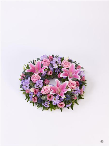 Lily and large-headed roses in pink are nestled amongst freesias and lisianthus in lilac along with blue eyngium and foliage in this circular wreath. Approximate diameter 50cm (19 inches).
