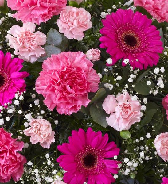 This traditional floral spray in varying shades of pink includes bright cerise germini plus light and dark pink carnations. These fresh flowers are carefully arranged and interspersed with white gypsophila, leather leaf and eucalyptus.