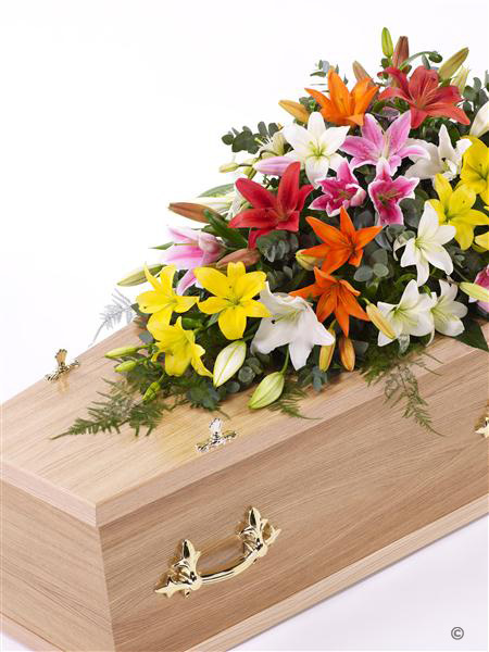 A blanket of Oriental Lily in mixed colours is beautifully complemented by an array of luxurious deep green leaves to create this simple but striking casket spray. Approximate height 184cm (6ft).
