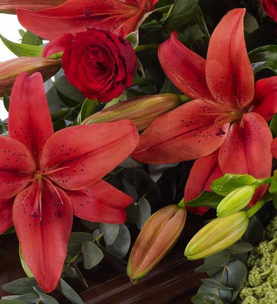 This striking casket display features a selection of fresh Asiatic Lily and large-headed Rose in shades of rich red. The flowers are carefully arranged with amaranthus, ruscus, eucalyptus and aralia leaves. Approximate height 122cm (4ft).